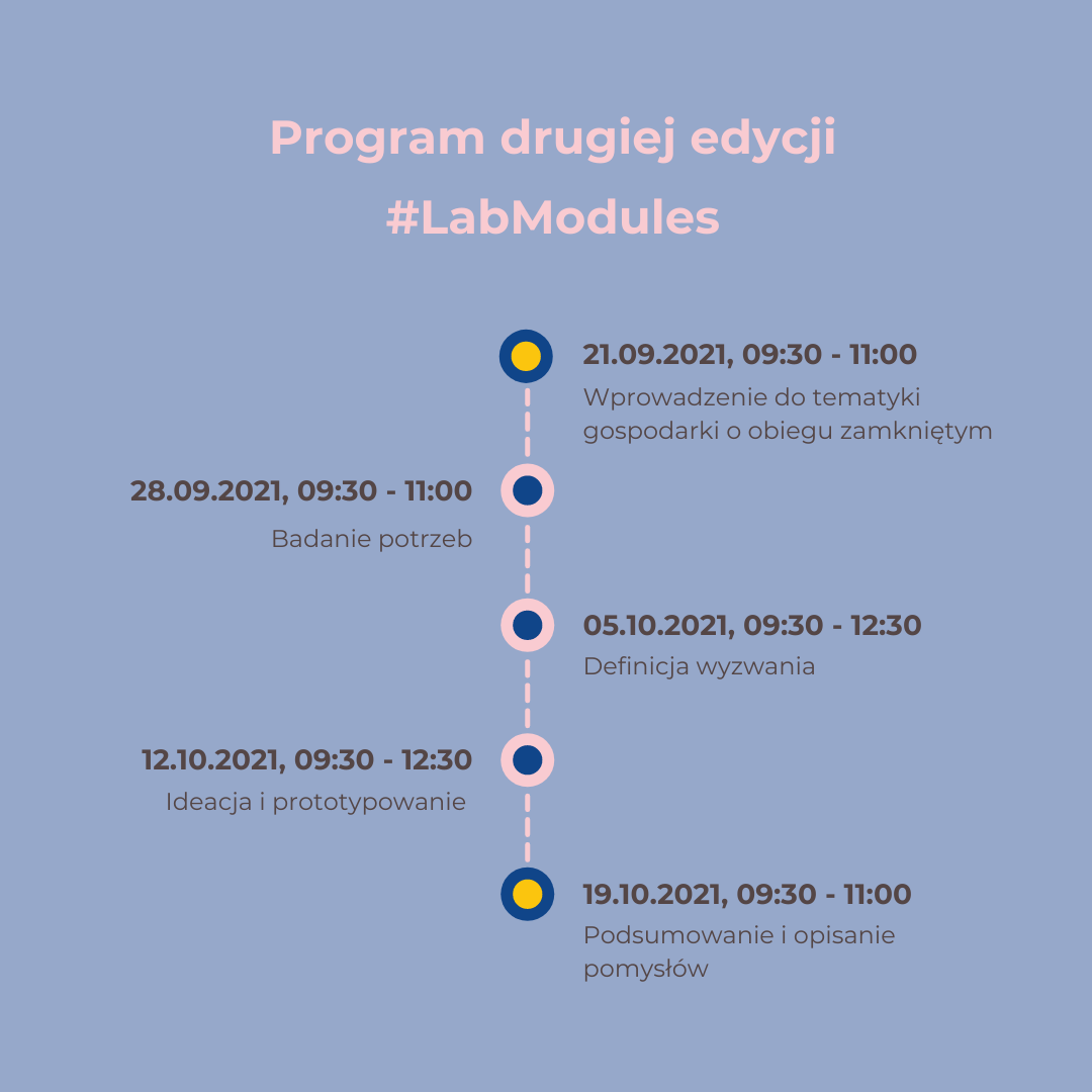 #LabModules to wydarzenie skierowane do wszystkich, którzy chcą tworzyć innowacje społeczne w obszarze gospodarki obiegu zamkniętego na rzecz terenów wiejskich oraz oddalonych od dużych miast. Do udziału zapraszamy ludzi pełnych pomysłów, znających realne problemy pojawiające się na terenach oddalonych od dużych miast. Podczas pięciu spotkań uczestnicy, pod okiem trenerek, będą wypracowywać innowacyjne rozwiązania dla wyzwań, z którymi przychodzi im się mierzyć każdego dnia.